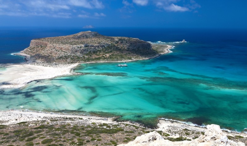 Пляж Балос, остров Крит. Это очень красивое, живописное место, где белоснежный пляж омывается прозрачными водами всех оттенков синего. Здесь, у пляжа, сливаются три моря, поэтому вода настолько необычна. Это и привлекает туристов купить горящие путевки в Греции именно сюда, на Крит. Инфраструктура на пляже почти не развита, есть парочка кафе.